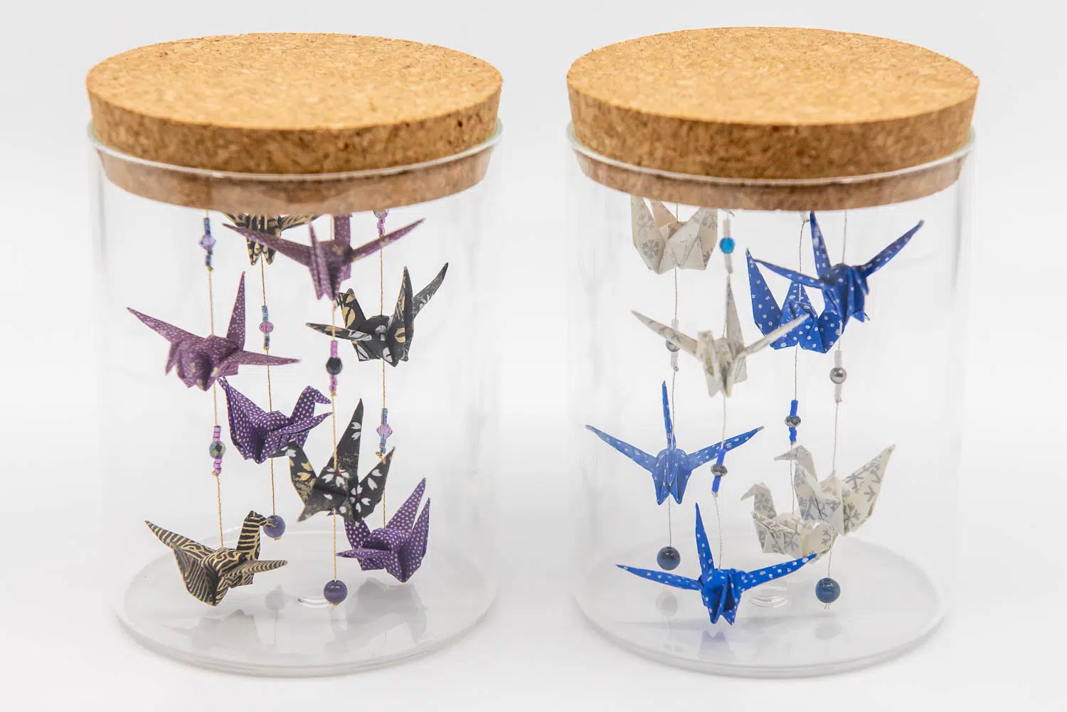 13 cm de haut . Bocal en verre avec couvercle en liège Papiers japonais pliés Perles